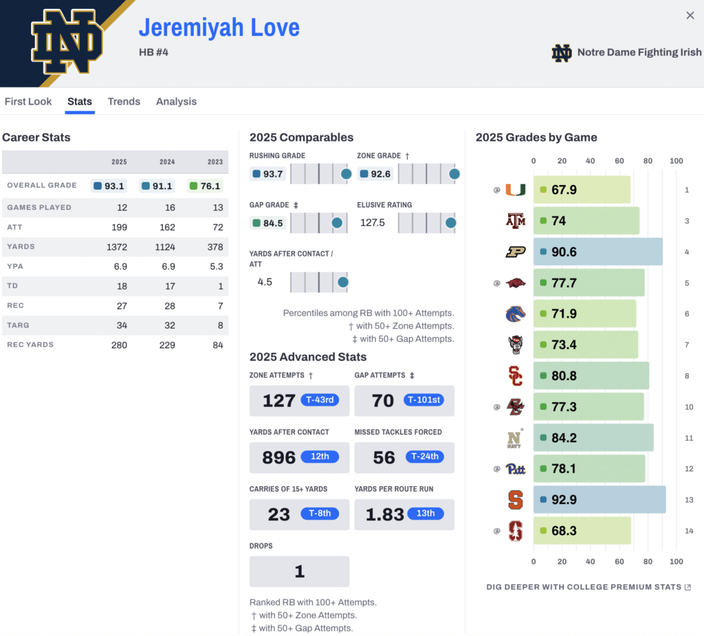 Cowboys fans who know the roster have already grabbed torches and pitchforks to revolt at the idea of this, but it isn’t out of the realm of possibilities. Love is a home-run threat out of the backfield, and his 726 breakaway rushing yards, 18 rushing touchdowns and 93.7 PFF rushing grade in 2025 all led the draft class.