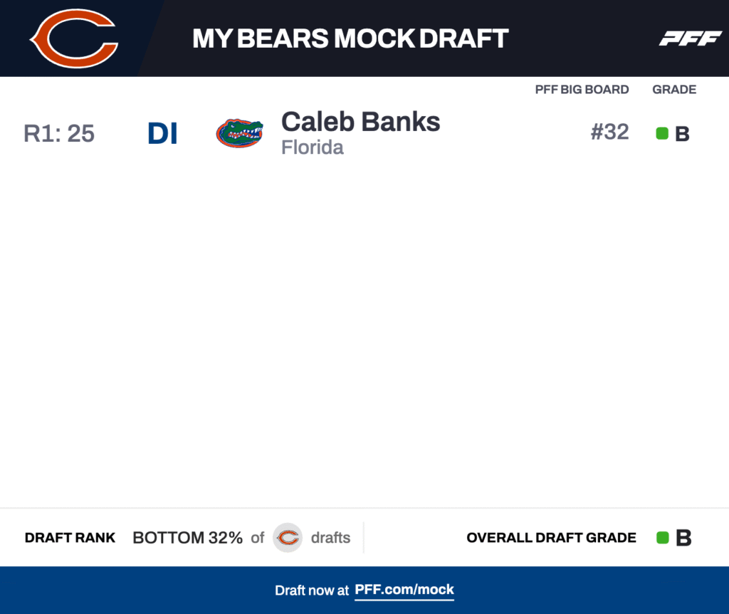 None of the Bears' interior defensive linemen notched a PFF run-defense grade above 56.0 in 2025, so addressing that early in the 2026 NFL Draft is a good way to fix the run defense. Caleb Banks is a massive presence in the interior at 6-foot-6 and 327 pounds with an 85 3/4-inch wingspan.