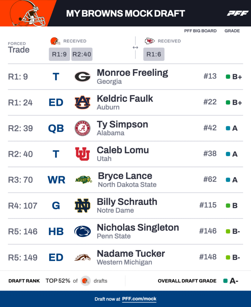 - 2026 NFL Draft season is here: Try the best-in-class PFF Mock Draft Simulator and learn about 2026's top prospects while trading and drafting for your favorite NFL team.