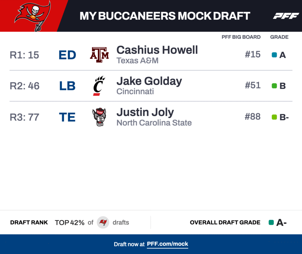 Tampa Bay needs a finisher off the edge, and Howell provides just that. He racked up 12 sacks and earned an elite 90.3 PFF pass-rush grade for Texas A&M in 2025. In fact, it was his third straight season of earning at least a 90.0 PFF pass-rush grade. He would create a formidable pass-rush duo with Yaya Diaby.