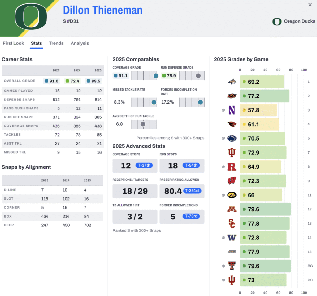 Cole Bishop is entrenched as one starting safety in Buffalo, but the team needs more help after its safety unit ranked 22nd in the NFL in PFF overall grade this season. Thieneman capped his excellent college career by earning an elite 91.0 PFF overall grade while picking off two passes and breaking up four more in 2025.