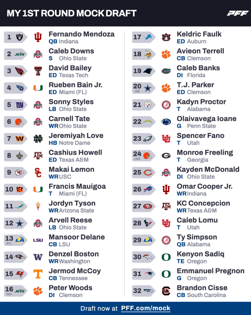 - 2026 NFL Draft season is here: Try the best-in-class PFF Mock Draft Simulator and learn about 2026's top prospects while trading and drafting for your favorite NFL team.