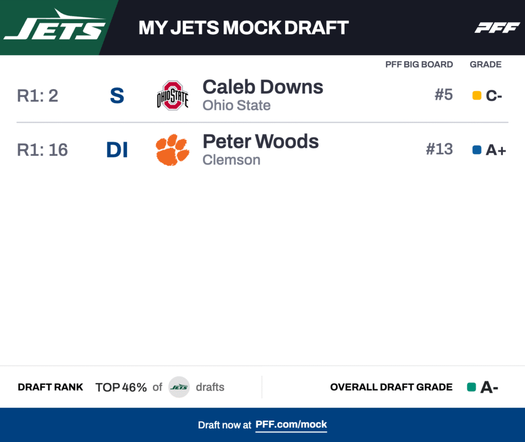 The Jets continue to upgrade their defense with the second of their first-round draft picks, adding some talent to the interior defensive line. Woods is coming off his lowest-graded season in three years, but with PFF overall grades above 83.0 in both 2023 and 2024, the talent is clearly there.
