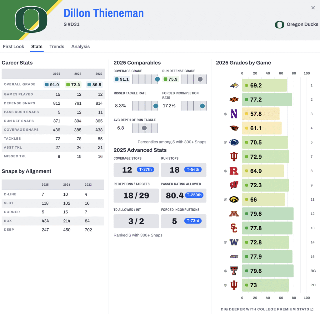 - Oregon's Dillon Thieneman in Round 1: Thieneman was outstanding in coverage in 2025, earning a 90.8 PFF coverage grade while recording two interceptions and forcing five incompletions. He followed that performance with a massive showing at the combine, running a 4.35-second 40-yard dash and posting a 41-inch vertical jump.