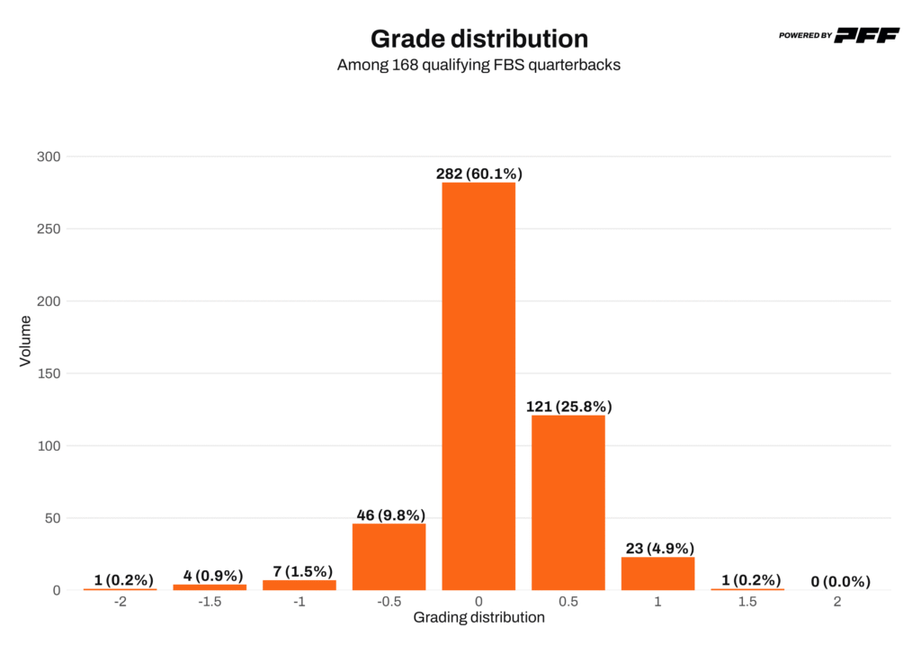 This bar chart shows the distribution of quarterback grades on PFF’s -2.0 to +2.0 play-by-play scale, illustrating how often each quarterback produces throws at each grading threshold. You can read more about the details of our grading system by clicking here.