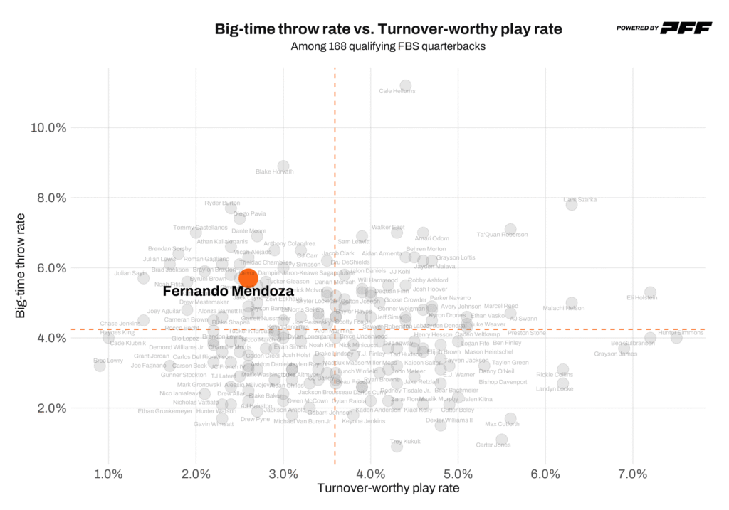 Mendoza is the best back-shoulder thrower in the class, consistently winning with pre-snap recognition, coverage and leverage identification, precise timing and elite ball placement. His plus-accuracy throw rate led all draft-eligible quarterbacks. He was also highly effective under pressure and in third-and-long situations.