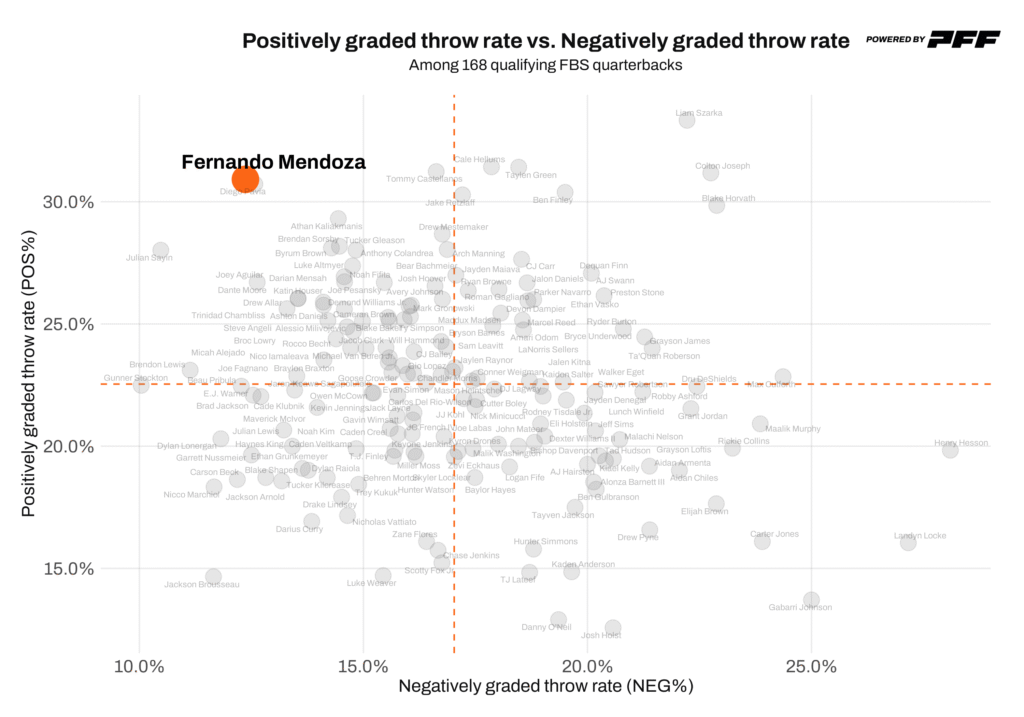 Each point on this scatterplot represents a quarterback, charted using PFF’s play-by-play grading scale. Every throw is graded from -2.0 to +2.0 in 0.5 increments, allowing us to capture both the frequency and quality of a quarterback’s decision-making. The X-axis shows a quarterback’s negatively graded throw rate, while the Y-axis shows their positively graded throw rate. Quarterbacks in the top-left portion of the chart pair high-end positive outcomes with fewer mistakes — the most efficient and sustainable profile — while movement toward the bottom-right reflects a growing imbalance between mistakes and impact plays.