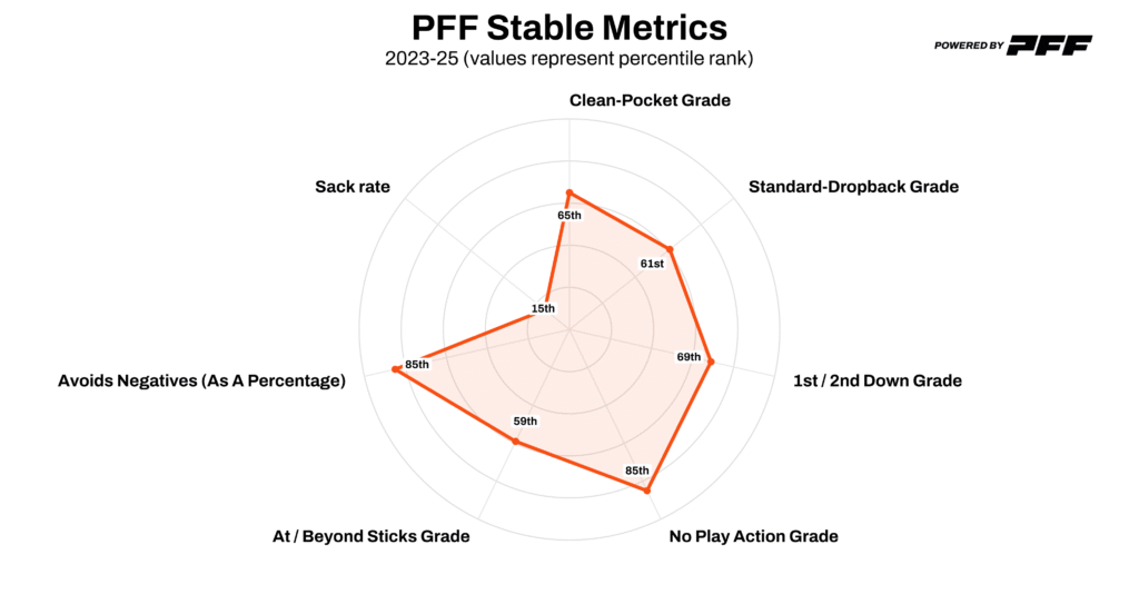 - Sack rate is on the higher side, but much improved in 2025