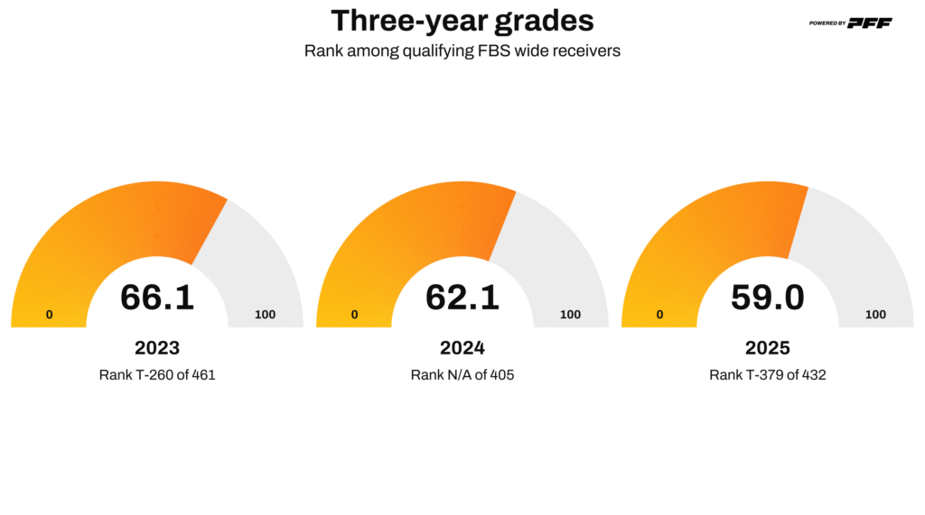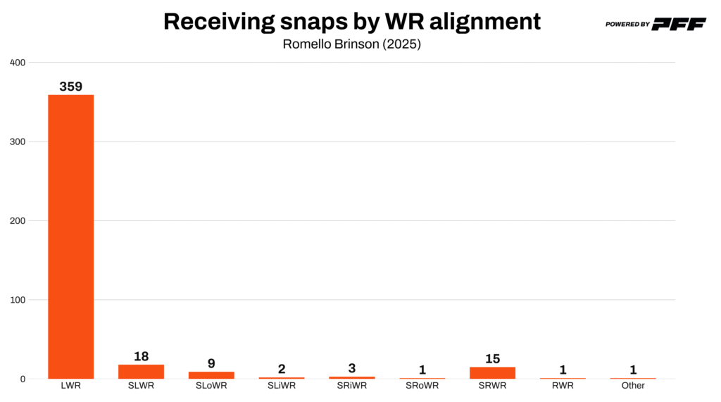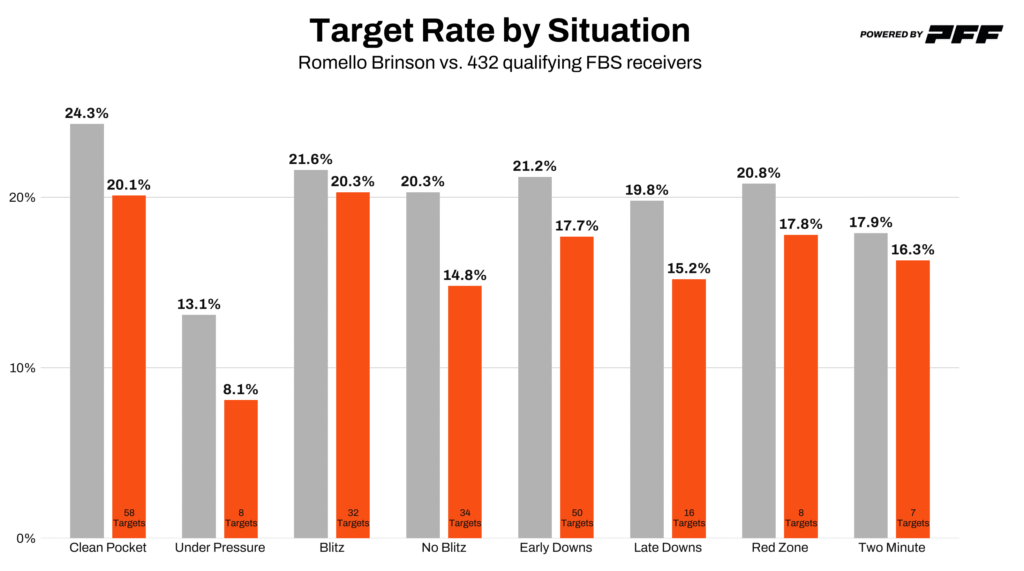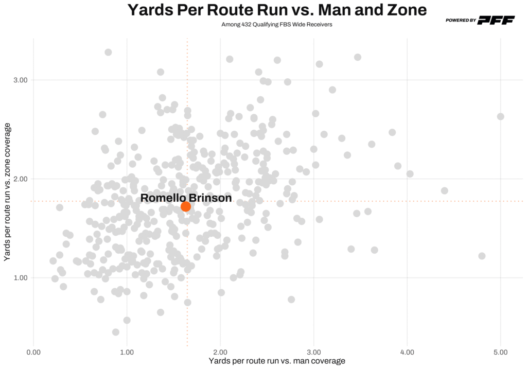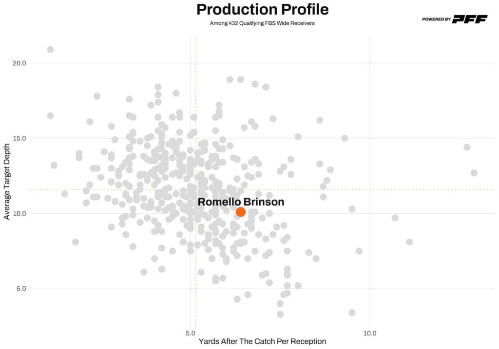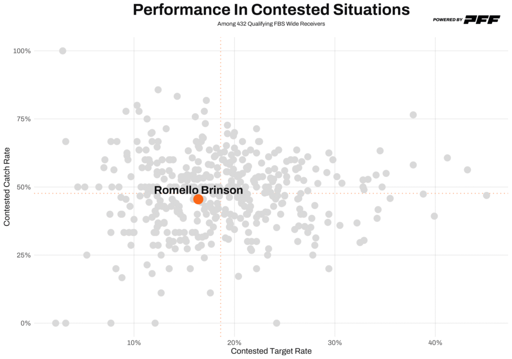 Brinson's slender build and lack of NFL-caliber athleticism mean that, to stick in the league as a “Z” receiver, he will need to significantly improve his catch consistency both in contested situations and on routine targets.