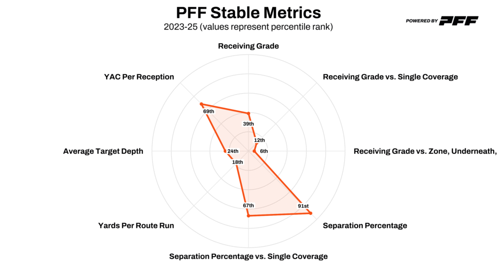 Separation by coverage look (All routes of 5-plus yards, 2025)