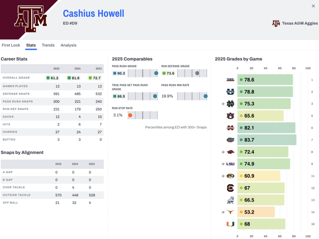 Yes, but for the Lions, I don’t really care — and they shouldn’t either. Mesidor will be 25 years old on draft night, but he’s a ready-made NFL pass rusher, having earned a 94.2 PFF pass-rush grade versus true pass sets in 2025, in addition to generating a 20.8% pass-rush win rate. Being ready to slot in immediately makes Mesidor worthy of a first-round pick for a team in a winning window.