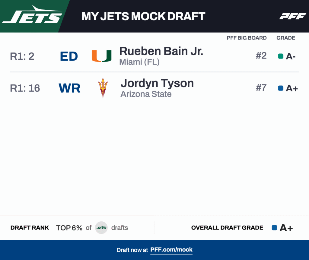 The Ravens have trench needs, but that doesn’t mean they have to address them in Round 1. They certainly could, but with Tate still on the board, I like him as an option. Tate improved his efficiency as a route runner this season and displayed the most reliable hands in the country, with an 85.7% contested catch rate, a 0.0% drop rate and an 89.0 PFF receiving grade.
