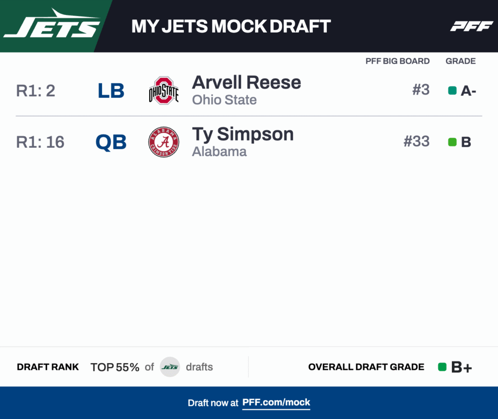 The draft starts in earnest at No. 2, and the Jets have plenty of options. New York sides with Reese, a player whom head coach Aaron Glenn will enjoy deploying as a chess piece in his defense. His eight sacks this year were tied for the fourth most among all college linebackers, and he logged an 86.5 PFF run-defense grade to boot. Reese can line up as either an off-ball linebacker or an edge defender in the Jets’ defense.