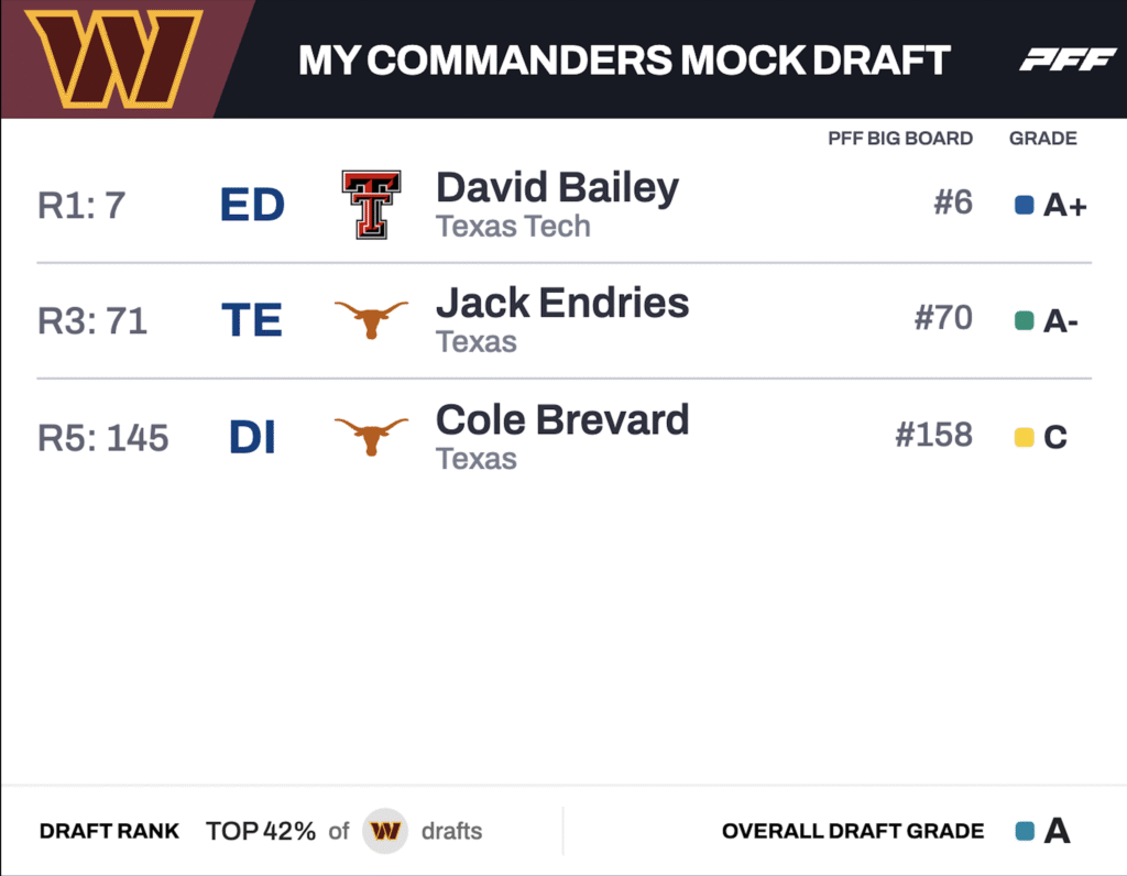 Brevard would add much-needed youth to Washington’s interior defensive line. He graded positively on 18.1% of run plays at Texas last season, and while his pass-rush skills still need development, his ability to occupy blockers inside makes him an intriguing value option at this stage of the draft.