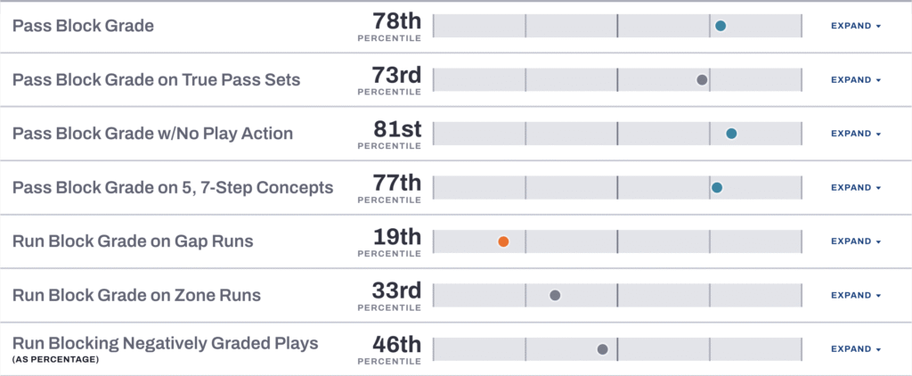 Make no mistake: New England’s offensive line did significantly better this year, placing 13th in overall PFF grade after being one of the worst in football the season prior. Adding Will Campbell and Morgan Moses helped shore up the tackle spots, but the interior was a bit shakier. Indeed, rookie Jared Wilson sported a 52.2 overall PFF grade, while Garrett Bradbury owned a 59.8 grade.