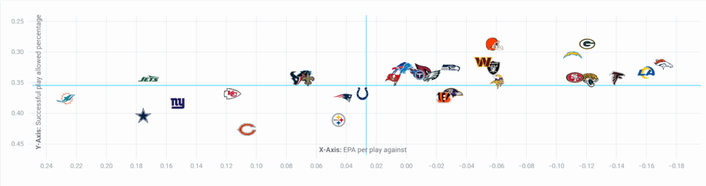 Highlighted statistical variables include success rate allowed, expected points added (EPA) allowed per play, explosive plays allowed, offensive plays allowed per game, offensive pass play rate faced, quarterback pressure rate and blitz rate.