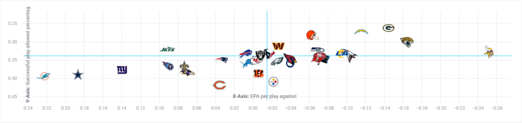 Highlighted statistical variables include success rate allowed, expected points added (EPA) allowed per play, explosive plays allowed, offensive plays allowed per game, offensive pass play rate faced, quarterback pressure rate and blitz rate.