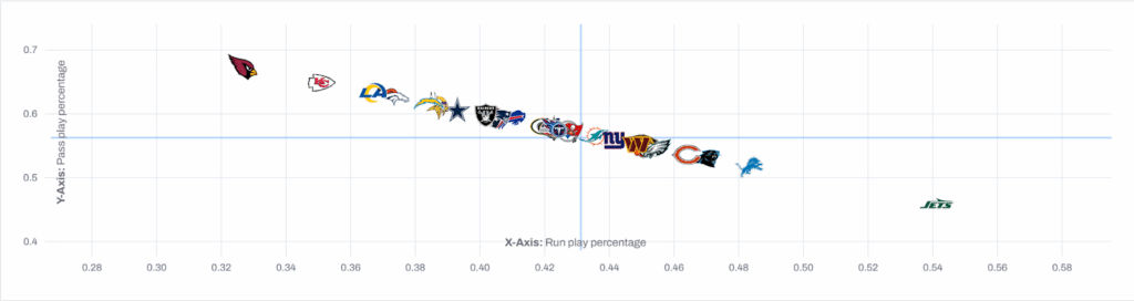 Highlighted statistical variables include neutral game pass play and run play rates, success rate, expected points added (EPA) per play, shifts, motion and play-action pass play usage, offensive play volume and pace.