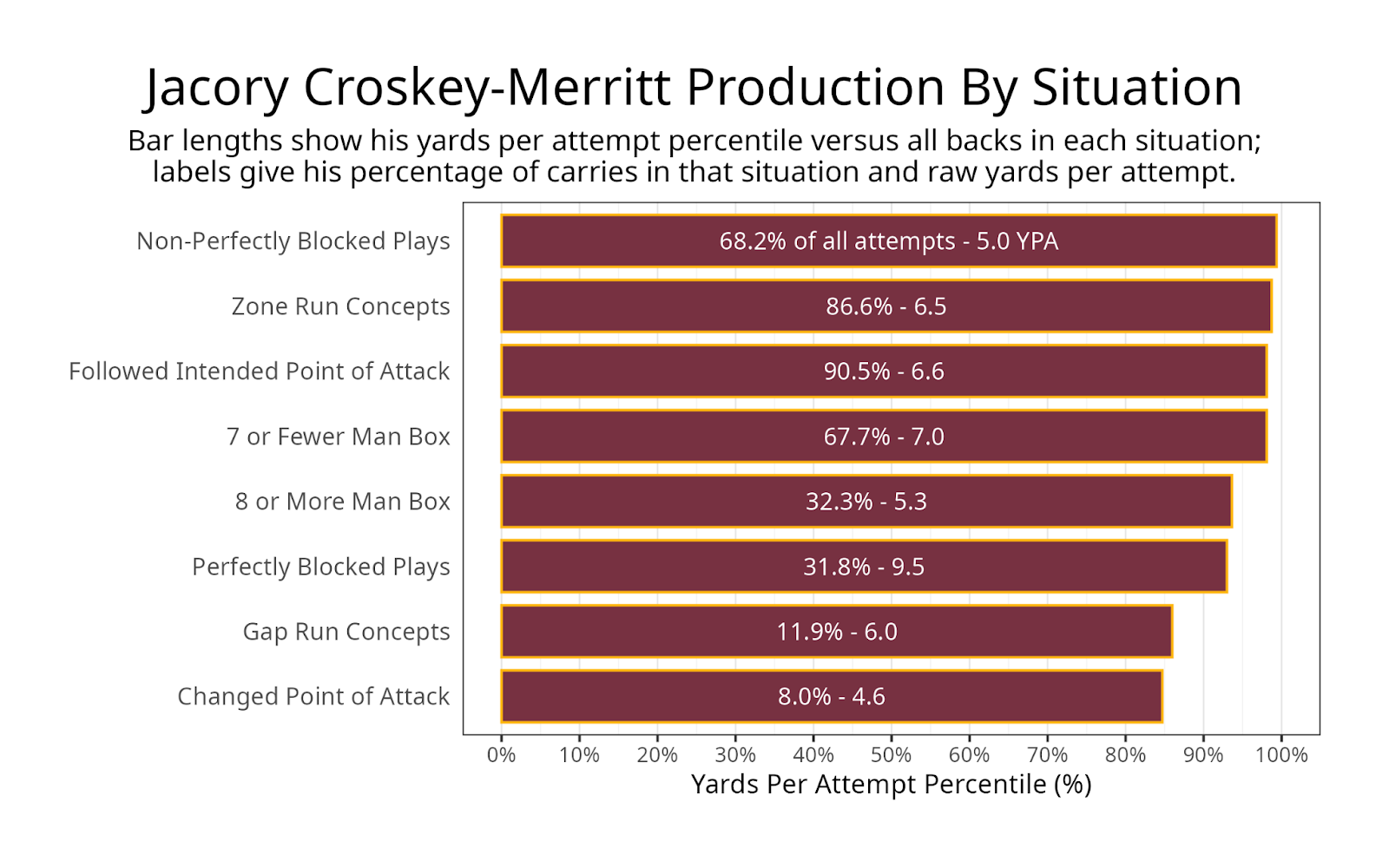 Croskey-Merritt impressed at the combine, finishing in the 80th percentile or better in the 40-yard dash, 10-yard split, vertical jump and broad jump. While his combine results were great, his PFF tracking data suggests a below-average speed compared to other running backs at the top of the draft class. However, he was faster than Cam Skattebo, Jordan James and Tahj Brooks.