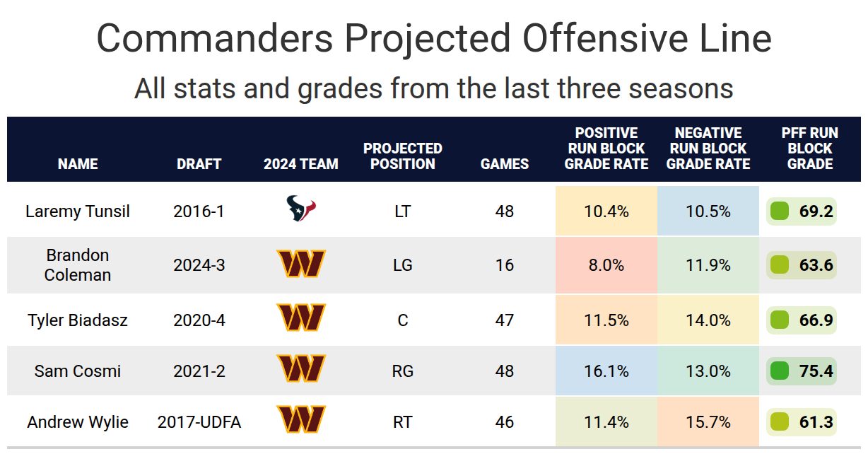 The Commanders made changes to the offensive line in 2024, which didn’t work out as well as expected. The three interior linemen all graded worse than at earlier points in their careers, despite being at an age where they should be around their prime. Brandon Coleman played fine for a third-round tackle for a rookie. The Commanders replaced their weakest link on the line with Laremy Tunsil, who is known for being an excellent pass protector, but he’s also been an adequate run blocker. The line should be improved over what it was last season, but the question is by how much.