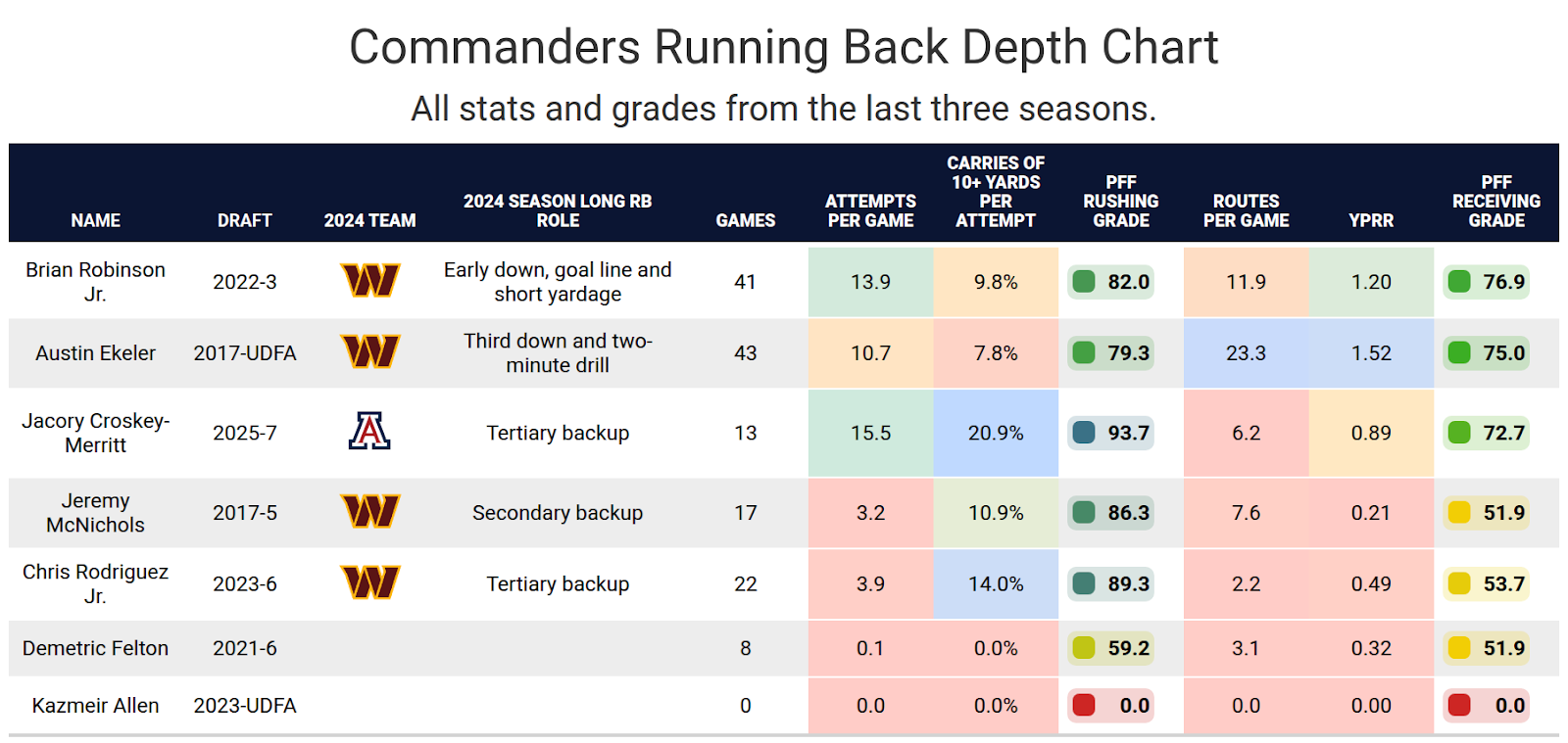 - Commanders' backfield shakeup: Croskey-Merritt's rapid ascent on the Washington Commanders‘ depth chart suggests a significant role in 2025.