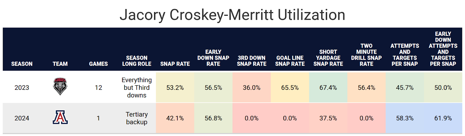 Jacory Croskey-Merritt spent 2019-2022 as a running back for Alabama State, playing a significant role in 2021 and 2022 with a steadily improving grade each season. He transferred to New Mexico in 2023 and significantly improved in both the running game and passing game, averaging a first down and breaking long runs at a ridiculously high rate, albeit against a lower level of competition than most running backs from the 2025 draft class. He was primarily used as a runner with New Mexico and was very rarely used as a receiver. When he was, he earned a decent grade.
