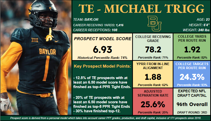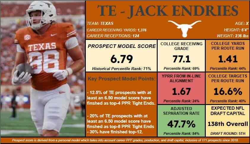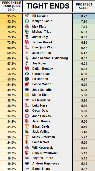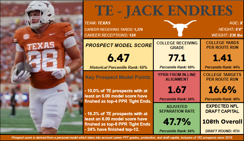 - It’s also worth noting that among 94 prospects to score below 7.00 in this model, only Jake Ferguson has finished among the top 12 PPR scorers at the position — a group that also includes 11 Day 2 prospects.