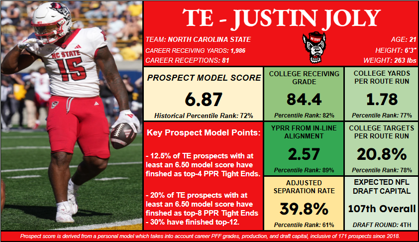 - Joly leads off the potential Day 3 tight ends in this class, though he does so without overly encouraging sleeper value based on his model score.