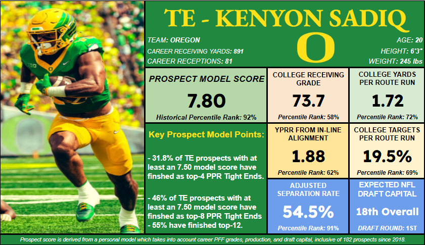 - Sadiq joins past tight end prospects who scored between 7.50 and 8.00 in the prospect model and also owned a sub-80.0 career PFF receiving grade — the likes of Ben Sinnott, Luke Schoonmaker, Greg Dulcich and Mike Gesicki.