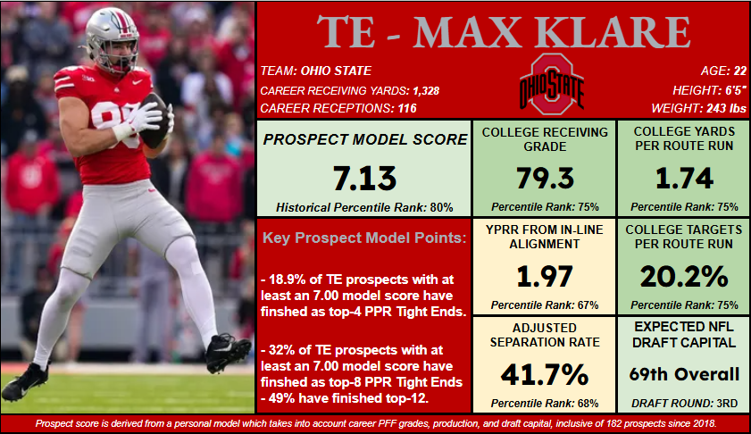 - Klare leads the late Day 2 tight end options at this point in the offseason, and while a lot of his career receiving metrics are slightly better than Kenyon Sadiq's, he comes in a fair bit lower in the model due to expected draft capital.