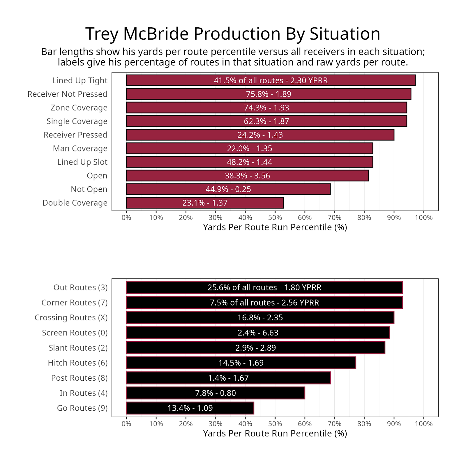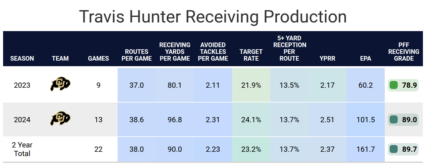 Hunter spent the past two seasons as a full-time wide receiver and cornerback for Colorado. His efficiency at wide receiver was strong but not elite, and he produced on a surprisingly high sample size, given his additional playing time on defense. His numbers improved across the board from 2023 to 2024. His production by situation was strong, too, but it’s worth noting that many of his routes were gos or hitches.