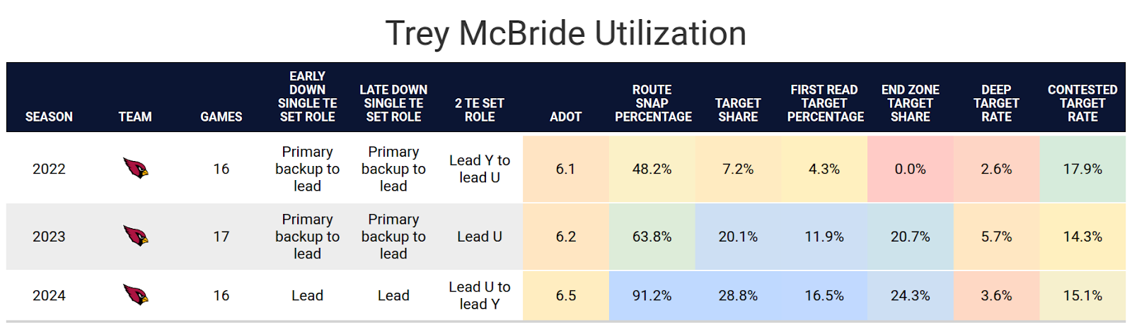 It’s worth noting that McBride has a relatively low average depth of target and is rarely targeted on deep passes. McBride caught 90 passes for 727 yards on short passes or passes from behind the line of scrimmage. Both ranked second to Brock Bowers, posting over 100 yards between them and third place. On intermediate and deep passes, McBride has 21 receptions for 419 yards, which ranks fifth among tight ends. The relatively low deep target rate might put a ceiling on McBride, making it unlikely he posts an all-time great season, but he can still be a top-two tight end in this role. Out of 18 tight ends with 11 or more intermediate or deep receptions, he was the only one without a touchdown on those passes. He should get a few more touchdowns on these kinds of passes from some regression.