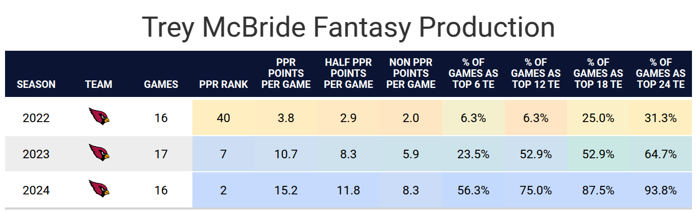 - Trey McBride has been incredibly consistent: McBride finished as a top-six fantasy tight end for over 50% of his games last season.
