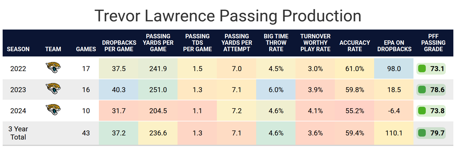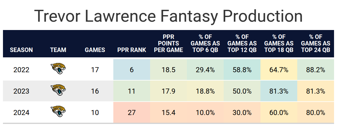 Lawrence’s fantasy value continued to dip in 2024. His per-game stats are somewhat deceiving, as he had a game with only 10 passing attempts, but he was held under 200 passing yards in five other games. He failed to reach 200 yards only twice in 2023. Two of these games were from a very low passing attempt total, but there was one game where he had 38 attempts and 178 yards. These games largely occurred before Brian Thomas Jr. fully broke out and while Evan Engram was injured.