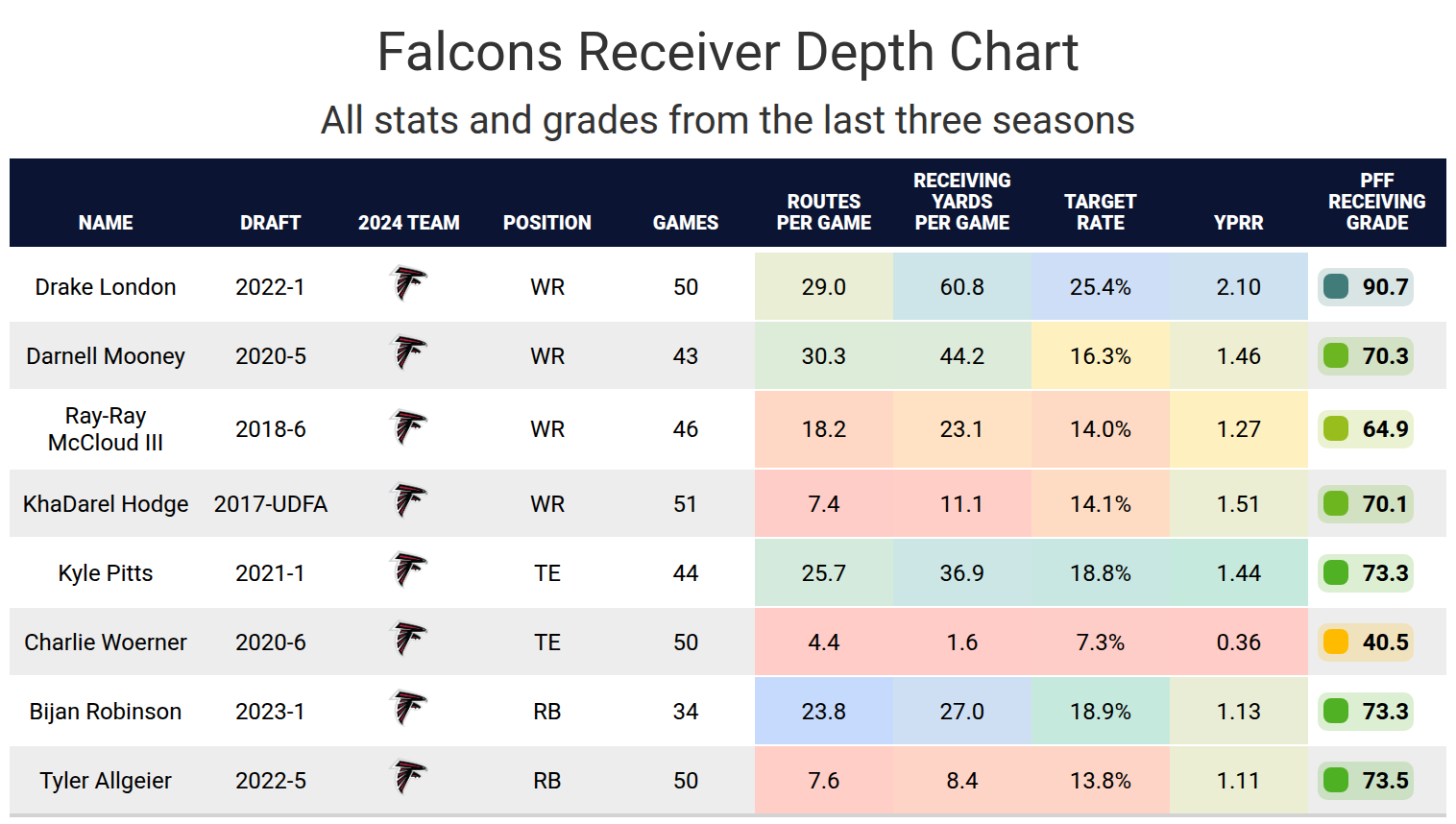 The Falcons kept their offense intact from last season, focusing all of their free agent and draft efforts on defense. The top eight skill players and four of the five offensive linemen remain identical to last season. The one change was at center, where Drew Dalman left in free agency. The Falcons had a top-five team grade on passing plays when ignoring all quarterbacks, meaning this is one of the best supporting casts in the league.