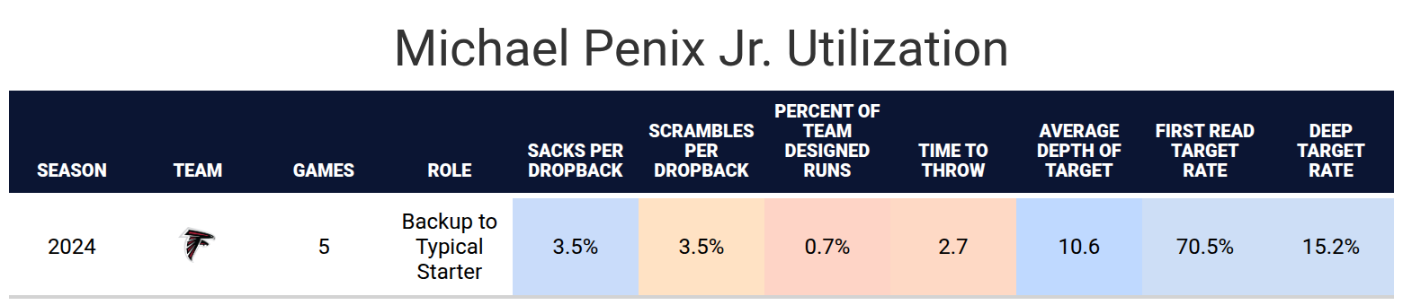 Penix had a very high average depth of target and a high deep target rate, which will probably decrease this season. That will likely lead to more consistent fantasy value. This will contribute to a lower big-time throw rate, but ideally, it means more completed passes, allowing his receivers to do more work after the catch. He was often locked onto his first read, which was primarily Drake London, and that will likely decrease slightly this season.