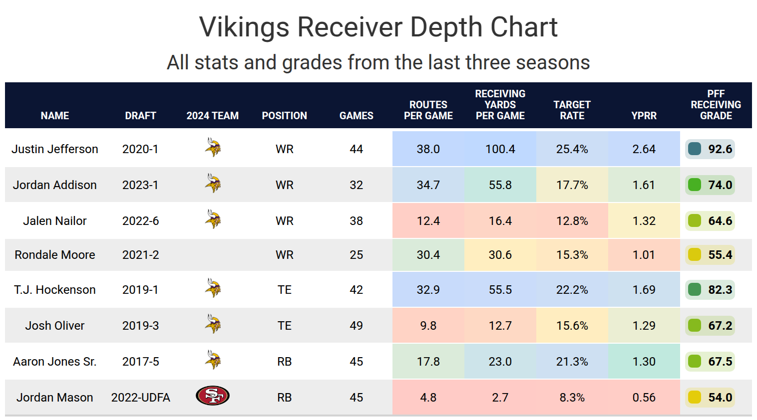 The Vikings had an average offensive line in pass protection last season, but there is reason to believe they will be much better this season. Brian O’Neill is the only returning full-time starter, and he was one of the best pass-protecting right tackles last season. Christian Darrisaw had emerged as one of the best young left tackles in the league but missed half the year due to injury. The interior of the line wasn’t great, leading the Vikings to add Donovan Jackson in the first round of the draft in addition to free agents Ryan Kelly and Will Fries from the Indianapolis Colts. All of them should be at least minor upgrades over the 2024 starters.