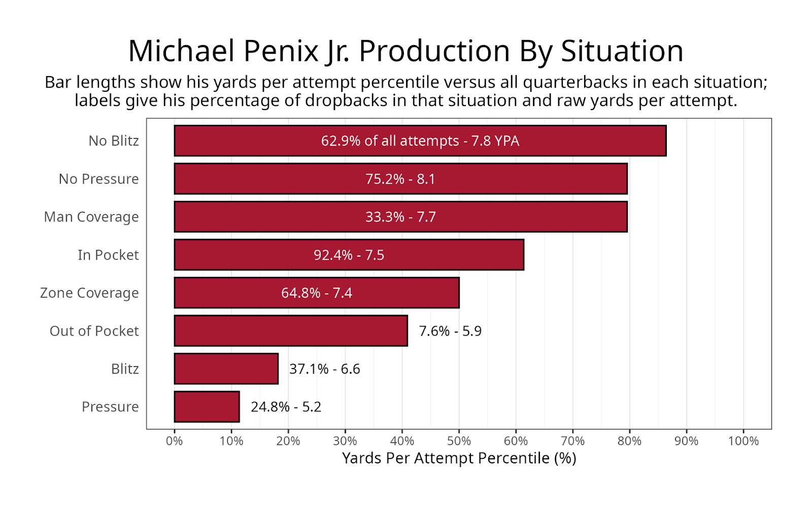 While his raw statistics were underwhelming, his big-time throw rate, turnover-worthy play rate and accuracy rate were all excellent. This led to a high 87.6 passing grade. Among quarterbacks with at least 100 passing attempts, he had the highest positive grade rate, just ahead of Lamar Jackson, and the highest big-time throw rate, just ahead of Josh Allen. While he didn’t have a high turnover-worthy throw rate, Penix earned a high negative grade rate, meaning his zero grade rate was relatively low.