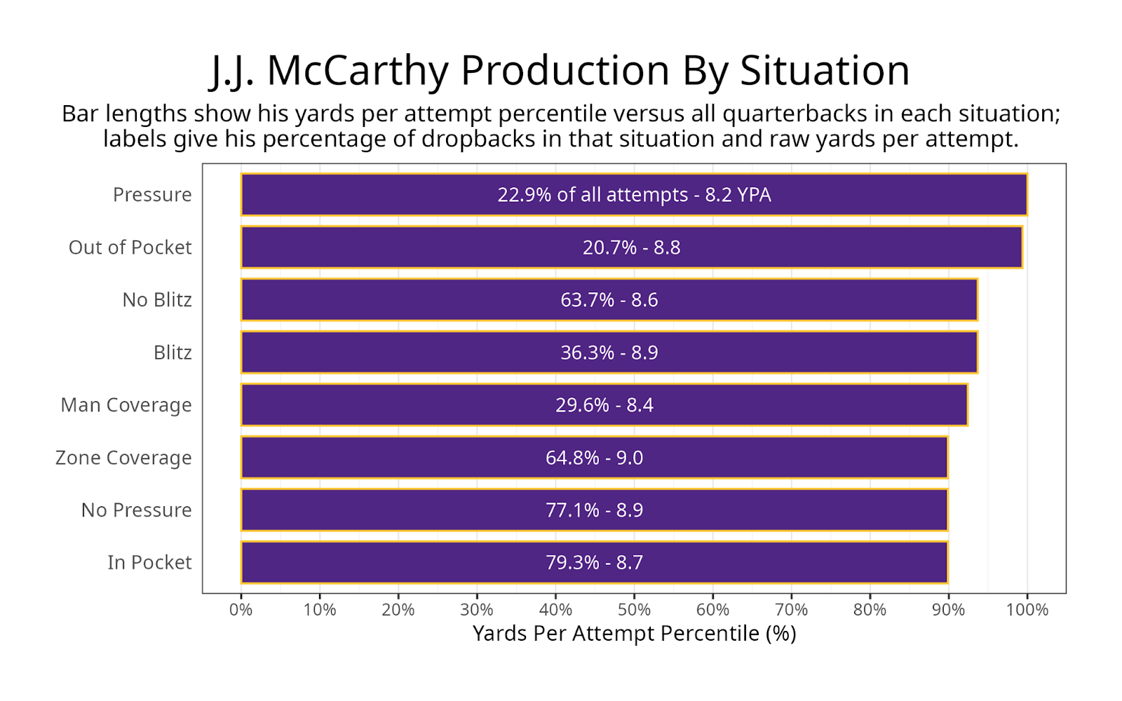 J.J. McCarthy spent three years as a quarterback at Michigan, initially as a backup to Cade McNamara, but he beat out McNamara for the starting job in 2022. He was never a high-volume quarterback due to Michigan’s run-first offense and constantly playing with a lead, but he was great on a per-play basis. He was in the 90th percentile or better in each situation. He improved significantly from his first year as a starter to his second. His dropbacks per game decreased, but his stats still increased thanks to a much higher accuracy rate.