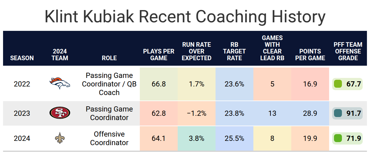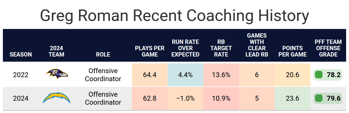 Roman has generally led run-first offenses, with last season being an exception, likely driven by the quality of the running back room. After investing heavily in the position this offseason, the Chargers are expected to return to a more run-heavy approach.