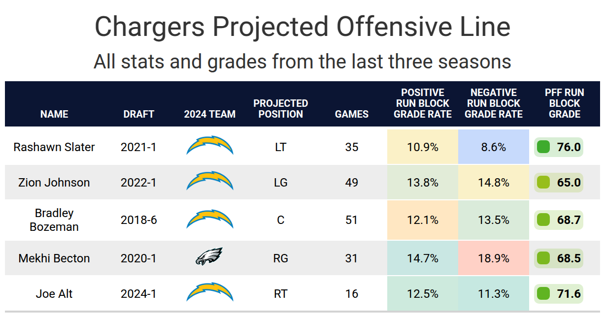 Hampton will be playing behind an offensive line that Los Angeles has heavily invested in through recent drafts. The team also added Mekhi Becton in free agency. While the unit does not feature any elite run blockers, it also lacks any clear liabilities. Both Rashawn Slater and Zion Johnson posted higher PFF run-blocking grades in 2022 than in 2023 or 2024. Although Slater is lost for the year to injury, Johnson will ideally return to his earlier form. Overall, the offensive line should not be viewed as a major asset or a significant concern.