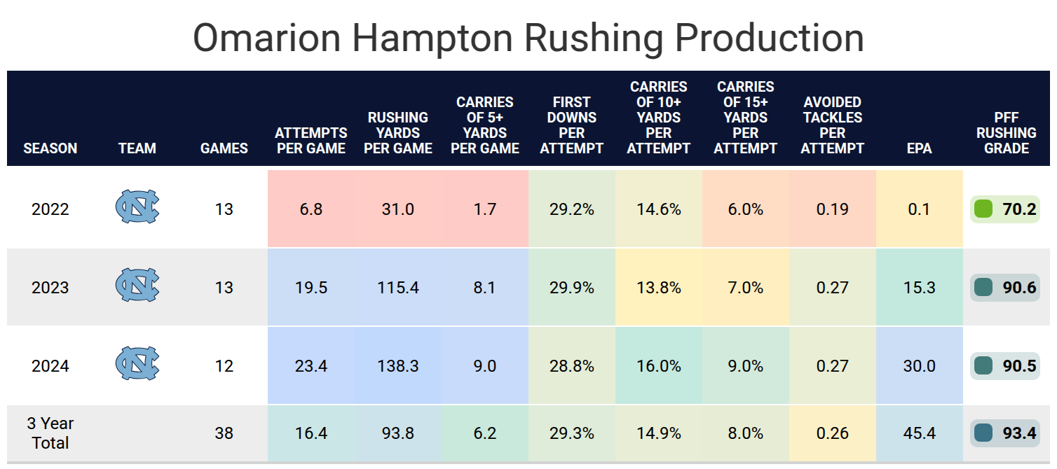 Hampton spent the 2022 season at North Carolina in a five-way committee at running back before taking over as an every-down back for the next two years. His volume improved each season. While there wasn’t significant growth in his rushing production between 2023 and 2024 — outside of a few longer runs that boosted his volume stats and EPA — he became more explosive as a receiver out of the backfield, even though his PFF receiving grade did not notably improve. Hampton ranks among the top 10 FBS running backs over the past eight seasons in average max speed, according to PFF's tracking data, with only Breece Hall and Keaton Mitchell clocking faster among current NFL backs.