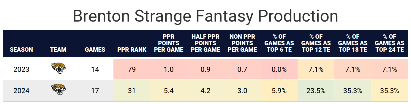 Brenton Strange didn’t show enough to be a consistent fantasy starter in his eight starts last season, and he now has more competition for targets due to a new offensive coordinator that’s had a lot of success with wide receivers. However, Strange is one of the few sleeper veteran options for someone who wants to take a swing late in a draft. Strange could be a great waiver wire target in-season if Brian Thomas Jr. or Travis Hunter suffers an injury.