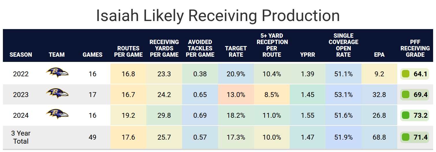 Isaiah Likely was a fourth-round pick by the Baltimore Ravens in 2022, joining a crowded tight end room of Mark Andres, Josh Oliver, Charlie Kolar and Nick Boyle. Likely made his mark in the preseason, catching all 12 passes thrown his way for 144 yards and a touchdown on only 30 routes, and four of those receptions came on contested catches.