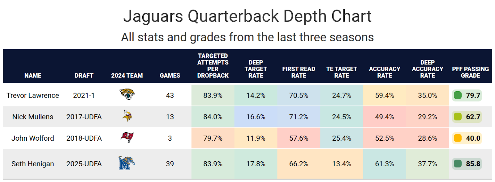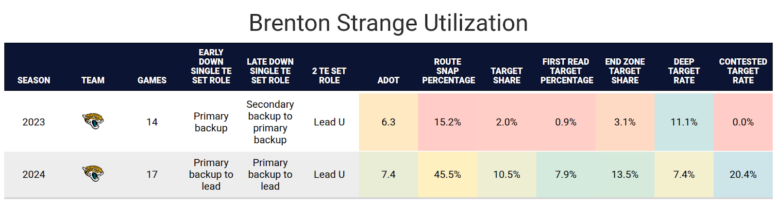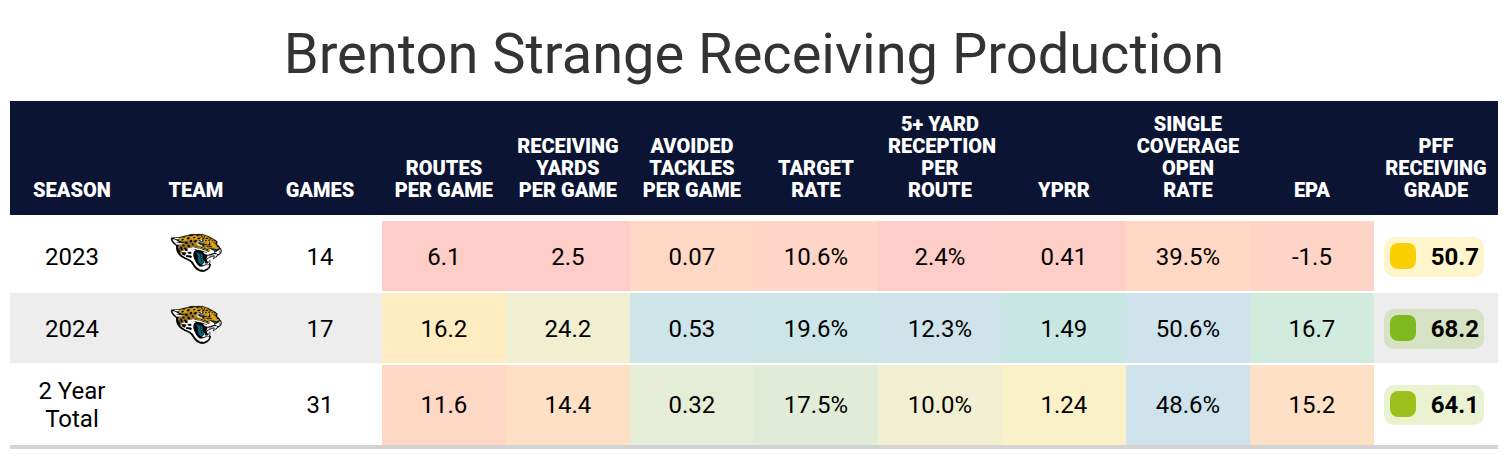 Strange will be catching passes from Trevor Lawrence, as he has throughout his NFL career. Lawrence had a high rate of throwing to tight ends with Engram. That will ideally help influence the offense and allow him to have a higher target rate than Coen’s past tight ends. However, Lawrence also has a very high first read rate, and Doug Pederson had no problem designing passes for tight ends. It’s unlikely Strange will have that high of a first read rate.