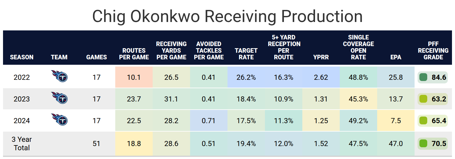 - Chig Okonkwo was the fantasy sleeper after his rookie season: Okonkwo’s efficiency was off the charts as a rookie, but he wasn’t able to mix great play with high route totals until the 2024 fantasy playoffs.