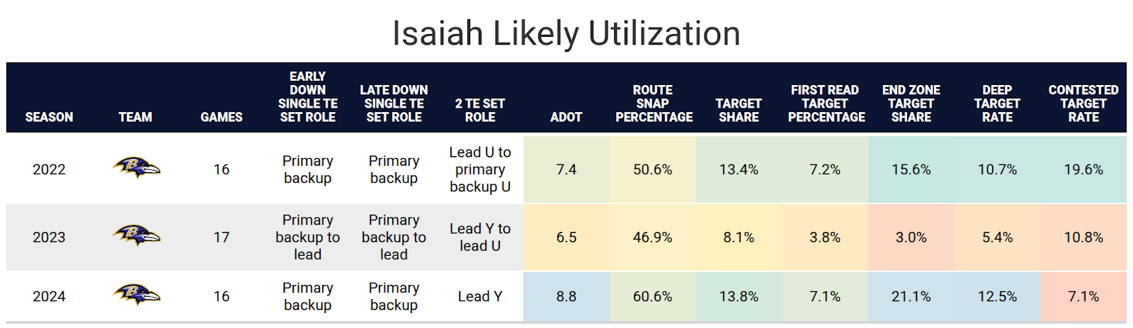 One reason for optimism is Likely is the younger up-and-coming tight end, while Andrews is older and potentially declining. His head coach, John Harbaugh, said he wants to see Likely be an All-Pro. Considering there are only two tight ends in each conference, that would either mean Likely makes it over Andrews, or they both make it over Brock Bowers, Travis Kelce, David Njoku and others. In order for Likely to make it over Andrews, he would likely need more playing time in 11 personnel.