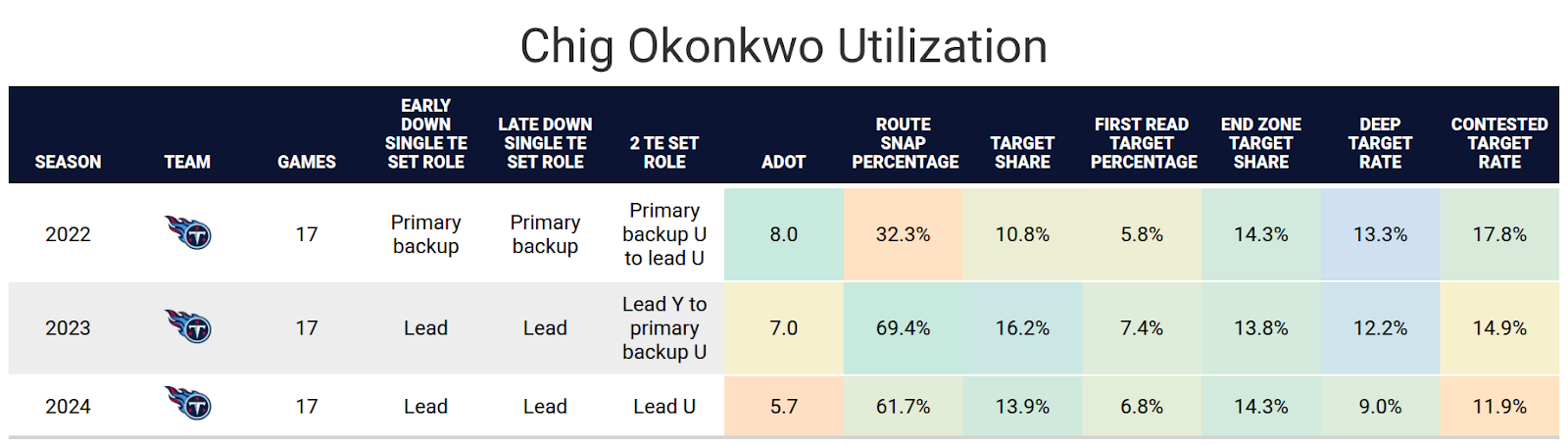 Okonkwo started his career third on the Titans' depth charts. Austin Hooper was the primary receiving tight end, Geoff Swaim was the primary blocker, and Okonkwo was the primary backup in both. He was excellent on a per-play basis, finishing with a high target rate on his limited routes. His 2.62 yards per route run was tied for the most by a tight end in a season in the last three seasons. He was tied with George Kittle from this season, and the third-place tight end finished with 2.23 yards per route run.