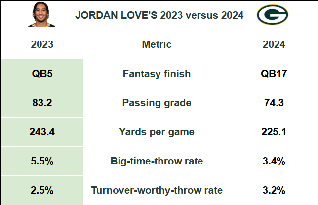 - Jordan Love will look to get back closer to his first-year starter production: After impressing in his first starting season, Love was unable to build on that momentum, but there’s hope that he can push for a better result in 2025.