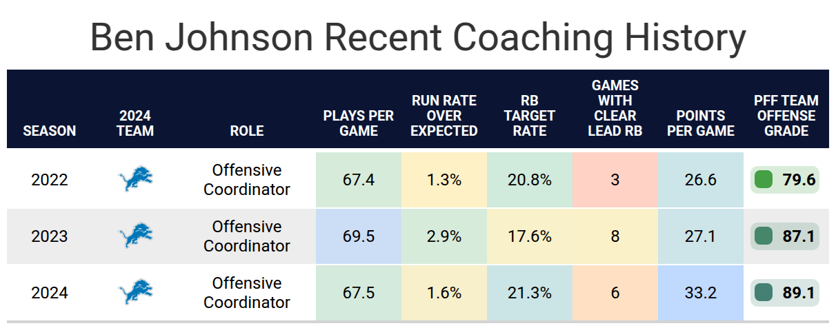 Ben Johnson is the new head coach of the Chicago Bears. While this has generally been viewed as a positive for Chicago, that is less clear if that will be the case for Swift. Johnson has typically had a high zone run rate, which is the opposite of what the Bears had last season. His role was reduced in his one year with Johnson, but his fantasy value was higher than in seasons where he had a bigger role, thanks to high efficiency. It’s a big concern that after one year as Swift’s offensive coordinator, the Lions decided to upgrade from him.